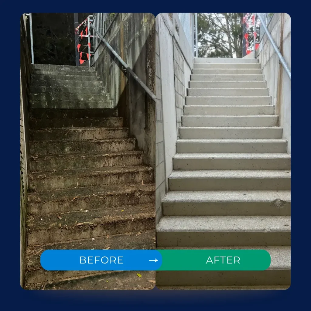 Our pressure washing services restore the appearance and safety of high-traffic and outdoor areas, effectively removing stubborn grime, algae, and moss that can accumulate in South East Queensland’s humid climate. This not only enhances the visual appeal of your property but also reduces the risk of slips and falls, ensuring a safer environment for staff, clients, and visitors. From pathways and car parks to external walls and facades, we help maintain your business’s professional image while prolonging the life of your surfaces by preventing premature wear and damage caused by built-up debris.
